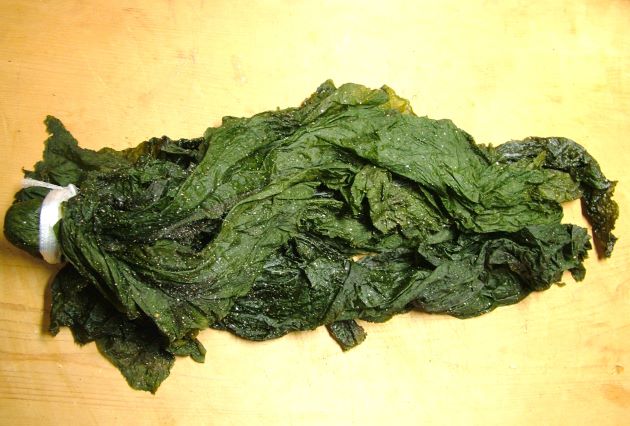 ヒロメのみそ汁 今回は生を使ったが、乾燥品を使ってもいい。生は水洗いして、乾燥品は水で戻す。これをカツオ節だしで煮てみそを溶く。みそは控えめにするといい。みそではなく酒・塩で味つけしてもいい。クリックで閉じますヒロメのみそ汁