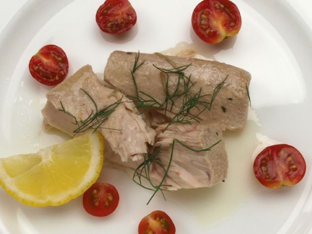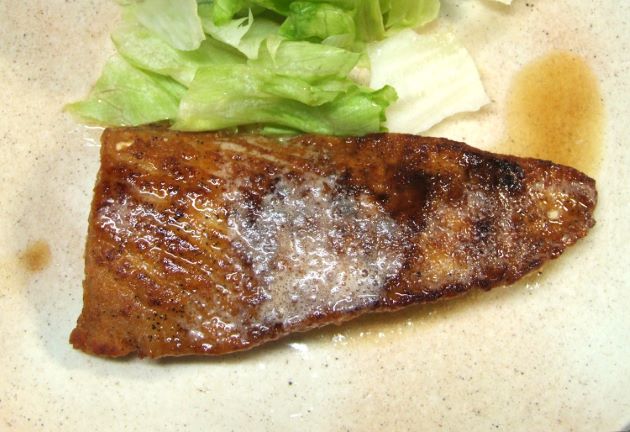 ビンナガマグロのムニエル 脂の乗ったものの方がおいしいが、脂のないものでも工夫次第でおいしい。切り身に塩コショウする。小麦粉をまぶして多めの油でソテーする。仕上げにバターで風味づける。このバターの香りと風味で淡泊なビンナガマグロが別の味わいになる。クリックで閉じます![]()