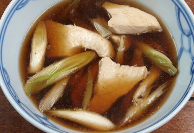 ビンナガマグロのねぎま汁 脂がのったものが手に入ったらクロマグロ同様に「なぎま(ねぎとマグロ)汁」、「ねぎま鍋」が作れる。しょうゆ・酒・みりん・水で割り下で、適宜に切ったビンナガマグロとネギを煮る。濃厚そうに見えるが、後口のいい汁。クリックで閉じます![]()