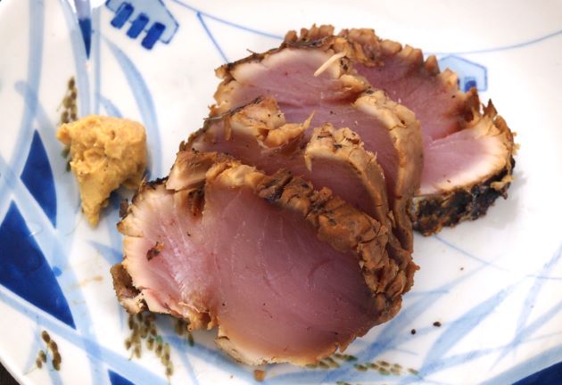 ビンナガマグロの焼きづけ 4分の一の背部分を皮付きのままあぶる。これを冷たく冷やした、地(醤油・煮きりみりん・煮切り、酒に強い人ばかりなら煮切る必要はない)の地に半日から一日つけ込む。わさびよりもからしほ方が合う。クリックで閉じます![]()