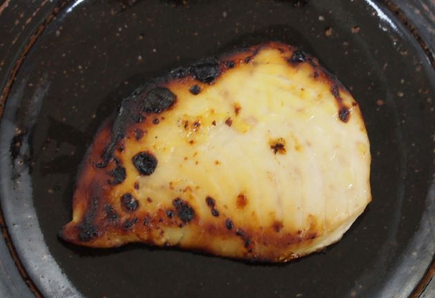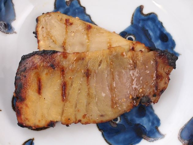 ビンナガマグロの西京焼き 脂ののったものが手に入ったら、みそと合わせて焼きものにしてもいい。振り塩をして、1時間以上寝かせて、出て来た水分を拭き取り、白みそとみりんの時につけ込む。一日以上漬けて、じっくり焦がさないように焼き上げる。少し硬く締まるがお弁当などには最適。クリックで閉じます![]()