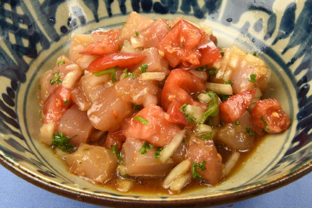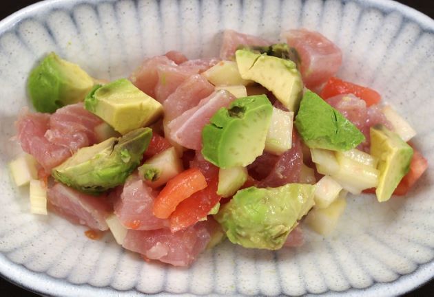 ビンナガマグロのポケ(ポキ) ハワイで切り身を「ポケ(poke ポキと発音することも)」という。生の切り身と野菜を合わせて味つけしたもの。材料、調味料などに厳密な定義はなく、要するに小振りに切った刺身(サイコロ状がきれい)に野菜などを合わせて、しょうゆでも塩でもなんでいいので味つけする。生魚入りのサラダのようなものでもあり、マリネのようなものでもある。クリックで閉じます![]()