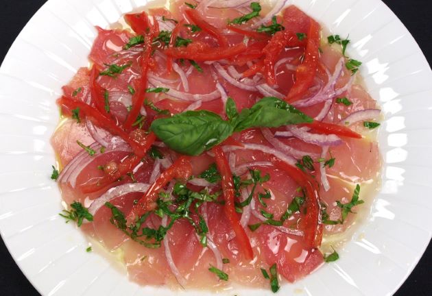 ビンナガマグロのカルパッチョ あまり脂ののっていないものは薄く切り、カルパッチョにする。皿ににんにくの風味をつけてオリーブオイルを敷き薄切りを並べる。塩コショウして上から叩き、香りのある野菜、ハーブを並べ、柑橘類などを搾る。クリックで閉じます![]()
