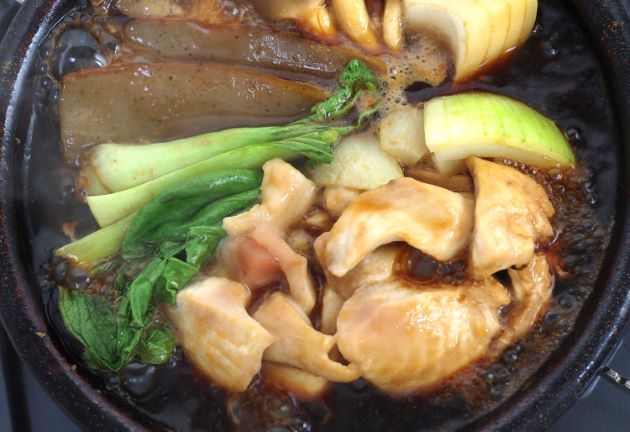 ビンナガマグロの魚すき(へか焼き、煮ぐい) 脂ののった部分を適当に切り身にして、すき焼きの地(しょうゆ・酒・砂糖・水、すき焼きのタレでもいい)の地で煮ながら食べる。島根県大田市ではこれにコンニャクを入れる。この煮染まったコンニャクが素晴らしい味になる。クリックで閉じます![]()