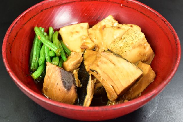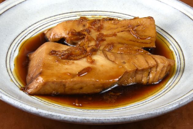 ビンナガマグロの煮つけ あっさりした味わいで火を通すと締まるので煮方にはコツがいる。切り身を湯通しして冷水に落とし、霜降りにし、水分をよく切る。鍋に酒・みりん・醤油(甘いのが好きなら砂糖)・水を煮立てた中で短時間煮る。中まで煮染まらないようにし、煮汁とからめながら食べる。クリックで閉じます![]()