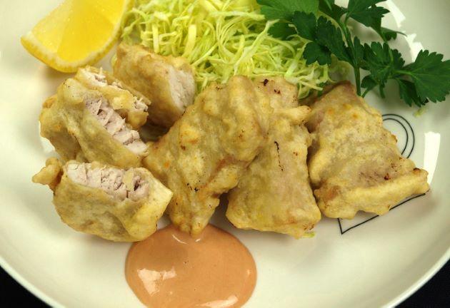 ビンナガマグロの味つけ天ぷら 脂のないものを単に揚げてもおいしくない。ここでは沖縄や長崎のように、塩コショウして、味のついた衣で揚げた。切り身に塩コショウする。衣は小麦粉・少量のマヨネーズ・塩・砂糖・水をつけて揚げる。衣は厚めがいい。意外にご飯のおかずになり、冷めてもおいしい。クリックで閉じます![]()