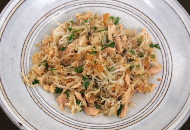 ビンナガの冊を小さく切る。これを好みの野菜(ここではミニトマト、玉ねぎ、小ネギ)と合わせて、ごま油と醤油で和えた。