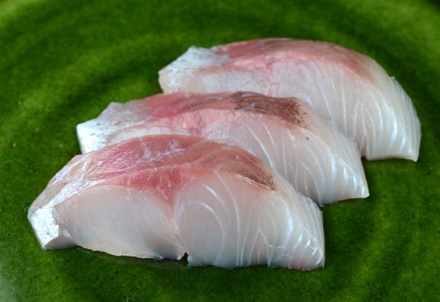 ブリモドキの刺身 黙って出すとブリの若い個体と思われそうである。少しだけ本種の方が身が緻密で水分が少ない。わさび醤油でも酢みそなどで食べてもおいしい。水洗いして三枚に下ろし腹骨・血合い骨を取る。皮を引いて刺身状に切る。クリックで閉じます![]()