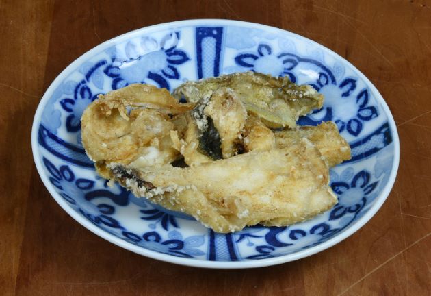 ホシカイワリの唐揚げ 腹骨や中骨、刺身にして切り落とした部分を集めて置く。水分をよくきり、片栗粉をまぶしてじっくりと二度揚げする。皮に厚みがあり、揚げると非常に香ばしい。身にも甘みがある。クリックで閉じます![]()