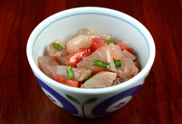 ホシカイワリのポキ(ポケ) セビチェにしてもポキにしてもいい。切り落とされる部分を無駄なく使えていい。端の部分などを細かく切る。ボウルなどに入れてしょうゆ・ごま油で味つけ。ネギ、トマトなどを加えて和える。万人向きの味わいで非常に味わい深い。ワインにも合う。クリックで閉じます![]()