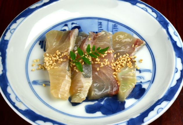 ホシカイワリの刺身 6月のやや大型個体は非常に脂がのっていた。大型なので背と腹の味わいが微妙に違っている。背の方は筋がなく均質な中に脂が混在して甘味がある。アジ科らしいうま味もあって非常においしい。あまりたくさんとれない魚ではあるが、刺身ではアジ科中トップクラスだ。