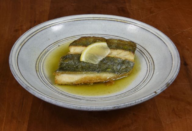 ホシカイワリのムニエル 三枚に下ろして切り身にする。水分をよくふき取り、塩コショウする。小麦粉をまぶして多めの油でじっくりソテーする。仕上げにバターで風味づけした。皮目・表面は実に香ばしく中がしっとり豊潤に上がり、非常に美味。クリックで閉じます![]()