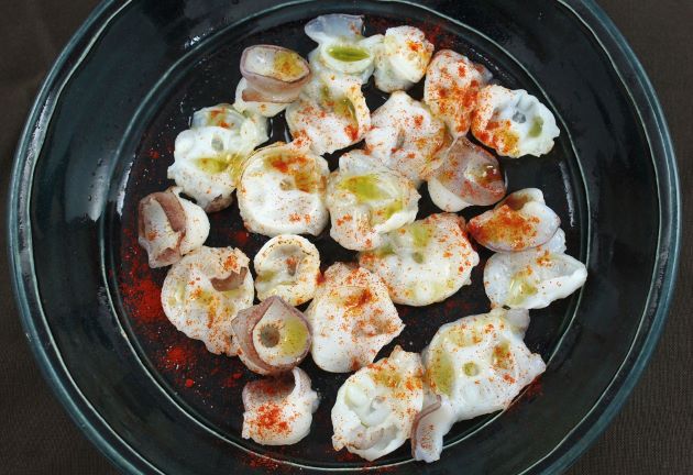 ミズダコのガリシア風 3分ほど塩ゆでして、薄くスライスする。皿に並べてカイエンヌペッパーを振り、オリーブオイルを回しかける。単純な料理ではあるが、オリーブオイルの香り、カイエンヌペッパーの風味があいまってとてもうまい。クリックで閉じます![]()