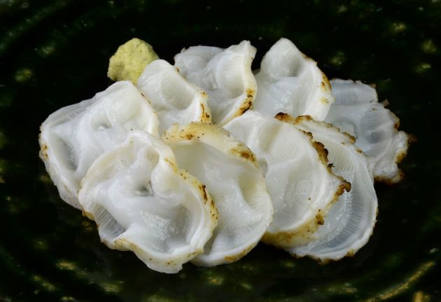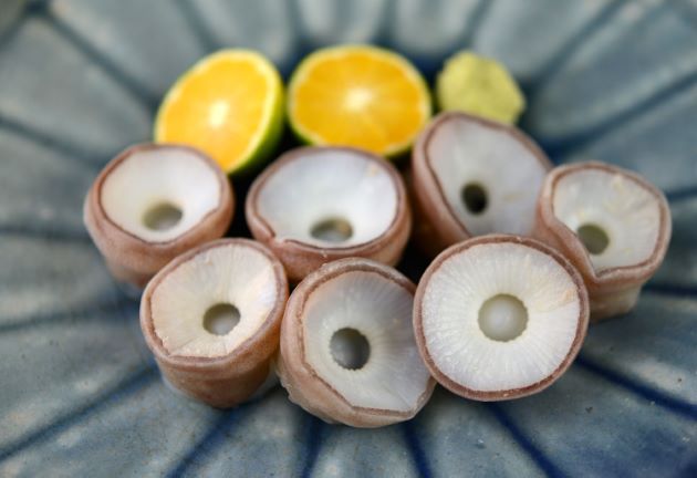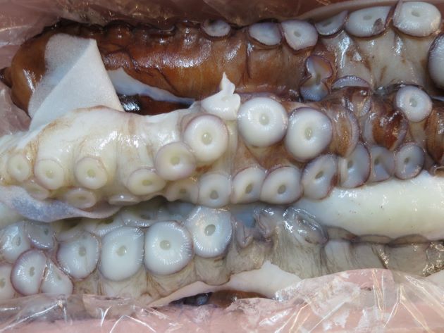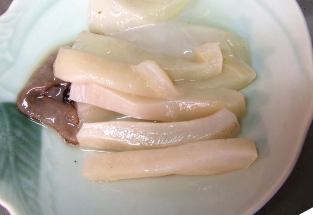 ほとんどが足(腕)だけになっている。軽くたたいて動くもので、見た目に透明感のあるもの。雌の方が味がいいとされているが、違いがよくわからない。味わい