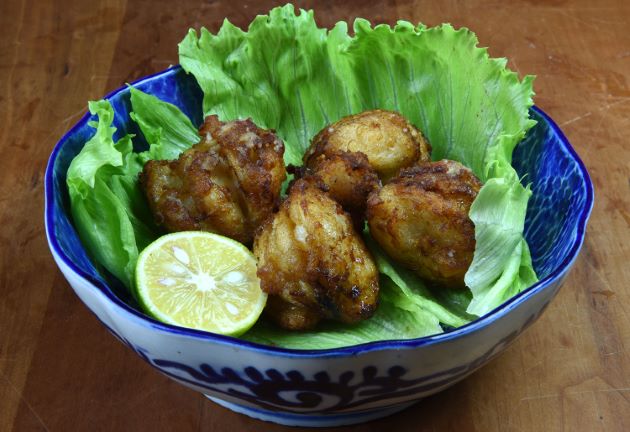 タコざんぎ(ミズダコの唐揚げ) 足(腕)を食べやすい大きさに切り、唐揚げにしたもの。タコ足(腕)は軽く塩ゆでにする。切れ目を入れながら適当に切り、酒・みりん・しょうゆで下地をつける。水分をよく拭き取り、片栗粉をまぶして高温で短時間揚げる。[北海道]クリックで閉じます![]()