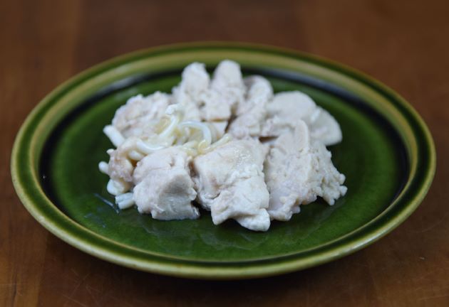 ミズダコの塩ゆで(ゆでだこ) 完全な生でも食べられるが、少し火を通した方がおいしいと思う。ここでは無駄な皮を取り、約2分ほど塩ゆでにしたもの。ゆで上がりを氷水に取り、水分をよく切り、薄切りにする。水分が多いもののタコらしい風味と甘味があってとてもうまい。