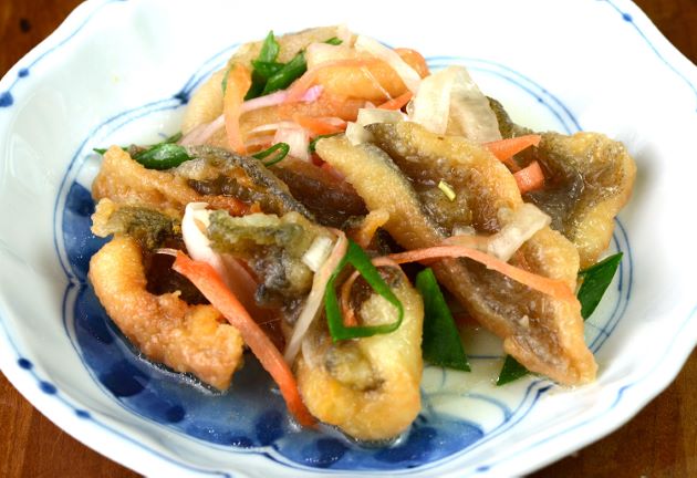 ムシガレイの南蛮漬け 今回は和風にしたが、エスカベッシュにしてもいい。水洗いして五枚下ろしにする。片栗粉をまぶしてさくっと揚げて、合わせ酢(米酢・砂糖・塩・昆布だしを合わせて一煮立ちさせたもの)につける。揚げた切り身に酢を加え、好みの野菜を乗せて、また揚げた切り身を乗せと重ねておき、漬け込む。クリックで閉じます![]()