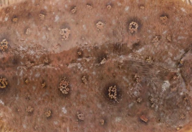 雌の方が大きくSL 40cm前後に、雄はSL 30cm前後になる。有眼側(表 カレイでは右側)に無数の虫食い状の斑紋があるが、3対の斑文が目立つ。口がカレイ類では大きめ。裏返すと透明感のある白。