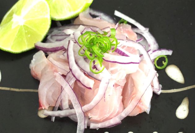 ヨゴレアオダイのセビチェ 大きさからして上身にすると無駄が出やすい。セビチェはその無駄をなくしてくれる。切り落とした部分や上身の端の部分を集めてライムと塩で締める。少し置き、青唐辛子と紫玉ねぎで和える。非常にさっぱりしていながら味わい深い。テキーラなどスピリッツにあう。クリックで閉じます![]()