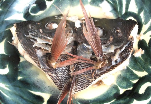 ヨゴレアオダイのまーす煮 沖縄県の郷土料理。少量の水と塩で短時間に煮揚げたもの。今回は兜(頭部)を梨子割りにして塩味で煮たが、思った以上に食べる部分が多く、皮や身にうま味が強く、身離れがいい。クリックで閉じます![]()