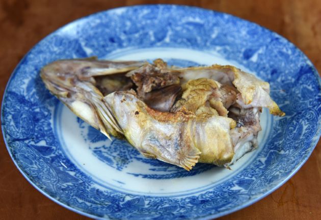 ヨシノゴチの煮つけ 頭部が大きいので、頭部を煮物や焼き物に使うことが多い。頭部の鱗をタワシなどでできるだけていねいに取る。湯通しして冷水に落として残った鱗とぬめりを流す。これを酒・醤油・水で煮る。頬(隠れ肉)など思った以上に食べられる部分が多く、とてもおいしい。クリックで閉じます![]()