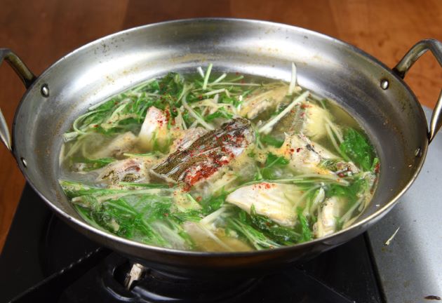 ヨシノゴチの鍋韓国風 水洗いして適当に切り、湯通しして冷水に落とす。残った鱗やぬめりを流し、水をきっておく。これを煮干しだしに酒・塩のつゆで煮ながら食べる。野菜は好みで、韓国のあまり辛くない唐辛子で辛味をつける。淡泊な味わいなのでちりよりもだしを使った鍋がいい。クリックで閉じます![]()
