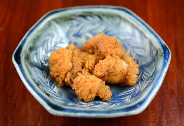 ヨシノゴチの真子煮つけ 春の固体は抱卵しているものが多い。真子をていねいに取りだし、適当に切る。鍋に酒・砂糖・醤油・水を煮立てておき、そこに落としていく。未熟なものの方がおいしい。卵粒が細かく煮てもパサつかず、ほくほくと甘味がある。クリックで閉じます![]()