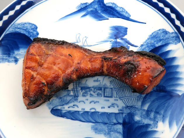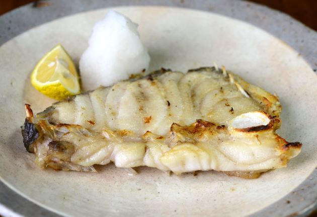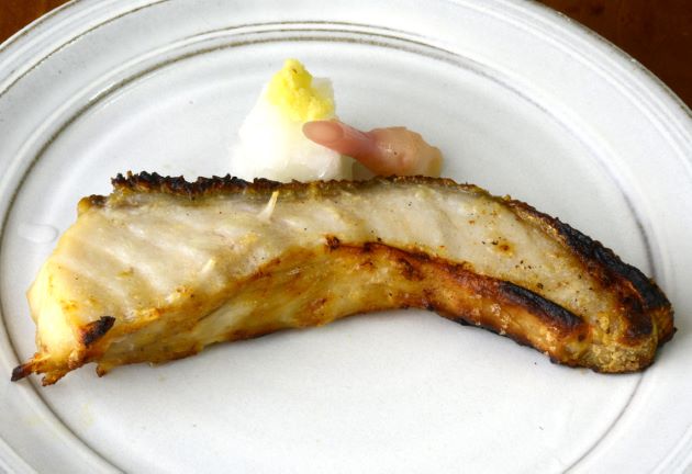 アブラボウズの塩焼き(背) 大型魚なので背と腹の脂の量、身質は大いに誓っている。ここでは背の部分を切り身にして塩をすり込むようにまぶす。1時間ほど寝かせてじっくりと焼き上げる。身は適度にしまり、脂の甘さも感じるが、しっかり魚のうま味もある。クリックで閉じます![]()
