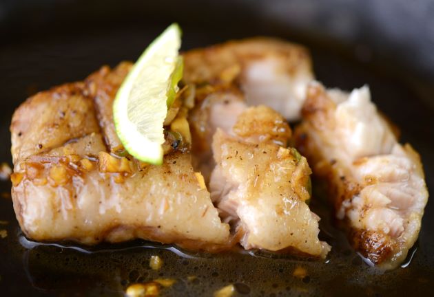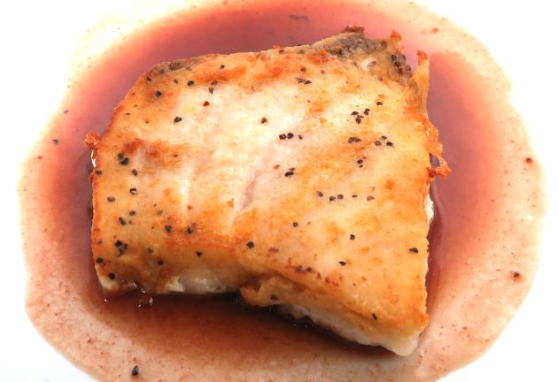 アブラボウズのステーキ(原) 背と腹では脂の量、食感が違う。腹部は脂が多く。ソテーすると大量の脂を吹きだし、脂で身を揚げながらソテーする感じになる。腹身を適当に切る。塩コショウしてソテーする。強火で身から出る脂をかけながら仕上げる。身を皿に取り、脂を捨ててみりん・醤油・にんにくでデグラッセ。柑橘類を絞り込んでソースにする。クリックで閉じます![]()