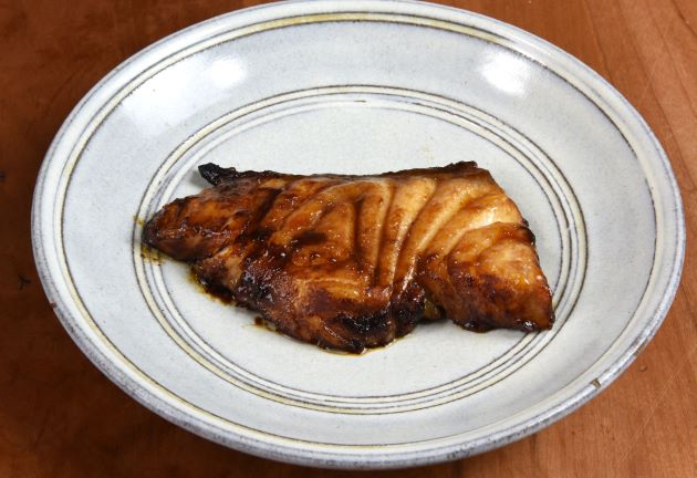 アブラボウズの幽庵焼き(祐庵焼き) しょうゆ、酒、みりん同量を合わせた地に漬け込んで焼き上げたもの。日本料理の基本で、柚子などの香りをつけてもいい。柚子の香りづけをしたものを柚子庵焼きということもある。切り身にして脂が多い魚なので振り塩をする。半日寝かせて出て来た水分を拭き取り、地につけ込む。これをじっくり焼き上げる。クリックで閉じますアブラボウズの幽庵焼き