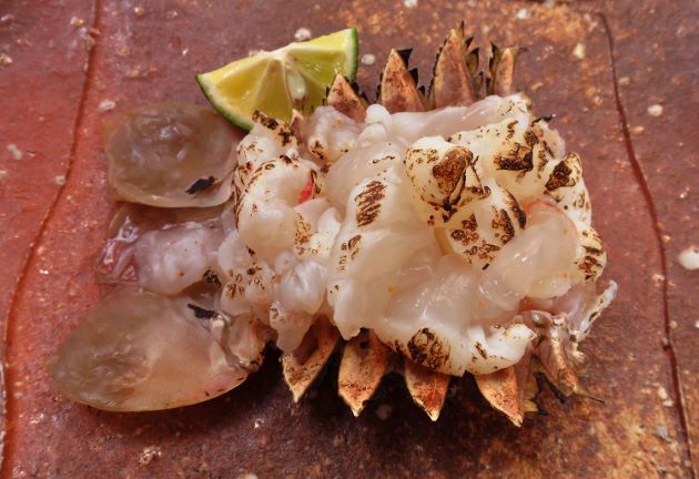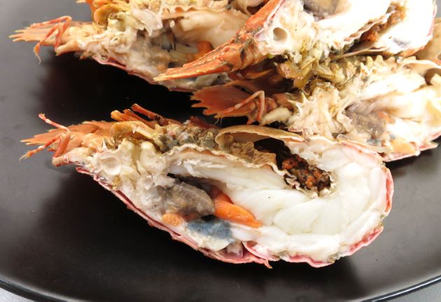 オオバウチワエビの具足煮 味わいは基本的にイセエビに近い。より身が締まっており、甘味も強いくらいだと思う。水洗いして適当に切り、しょうゆ・酒・みりんの味つけで短時間で煮上げる。身の甘さとしょうゆ、みりんの甘さがあいまってとても味わい深い。万人が好きな味だと思う。クリックで閉じます![]()