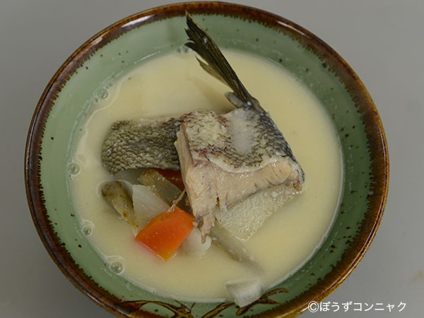 サケの牛乳みそ汁 少量のカツオ節だしに水を加えたもので切り身を煮て、みそをとき、仕上げに牛乳を加えたもの。北海道の方に教わったものだが、実に優れた家庭料理である。野菜は大根やにんじんにキャベツ、玉ねぎ、じゃがいもなどお好みで。クリックで閉じます![]()