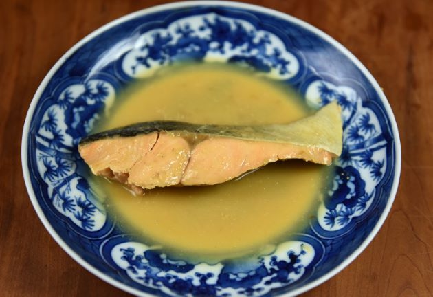 サケのみそ煮 比較的脂の落ちた秋のサケには独特の臭みがある。これを好きかキライかは分かれると思うが、煮ると少し硬く締まる傾向がある。この両方をみそで煮ることで解消できる。ほの甘く味つけするとご飯に合う。クリックで閉じます![]()