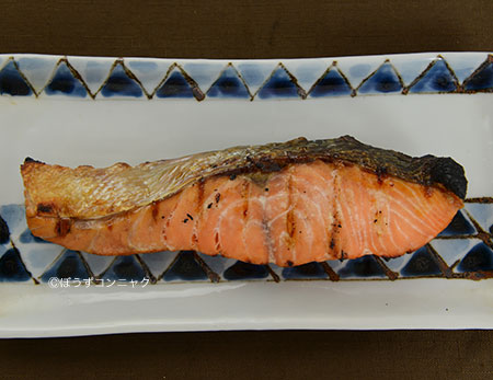 サケの塩焼き(秋ザケの塩焼き) 単に切り身に振り塩をして焼く、これがサケのもっとも基本的な料理法。今でも関東のスーパーでは塩焼き用のサケが売られている。サケの臭いが気になるときはサケを塗りながら焼き上げるといい。クリックで閉じます![]()