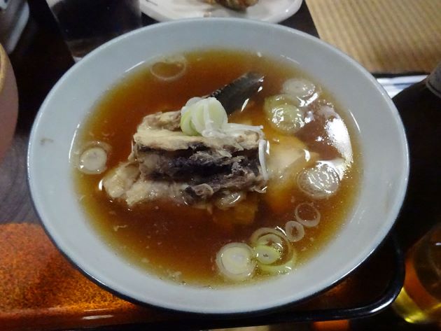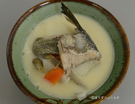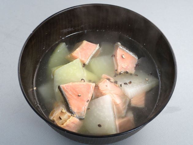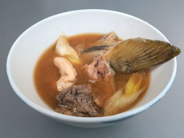 サケのどんがら汁(サケのがら汁、サケのざっぱ汁/しょうゆ仕立て) 山形県酒田市、遊佐町など庄内地方では「どんがら汁」、山形県最上地方鮭川村では「ざっぱ汁」という。サケのあら、内臓などをしょうゆ仕立て、みそ仕立てで作ったもの。クリックで閉じます![]()