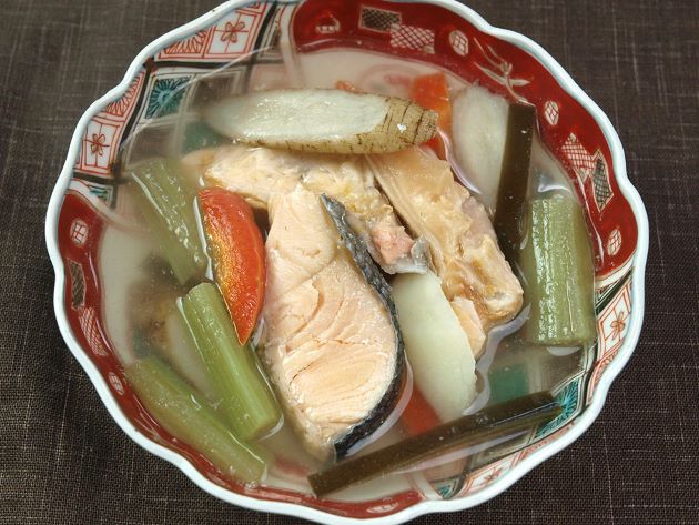 鮭汁 山形県では「ようしる」。サケの切り身の入ったみそ汁のこと。大根、焼き豆腐、ネギなどを加える。