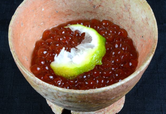 鮭のルイベ漬 生のサケをたぶん冷凍、しょうゆ味をつけてイクラと合わせたもの。[佐藤水産 北海道石狩市]