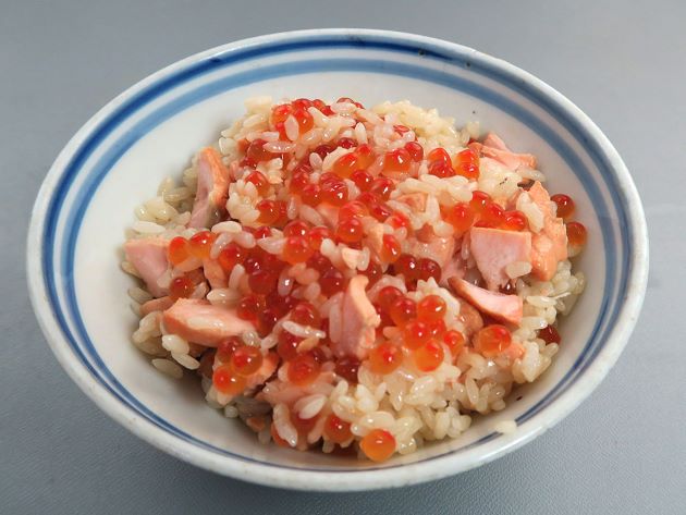 鮭の親子飯 三枚に下ろしたサケを一寸くらいに切り、甘辛く煮て細かくほぐしておく。卵巣はバラバラにほぐす。熱いご飯にほぐしたサケの身とイクラを散らし、煮汁をかけて食べる。