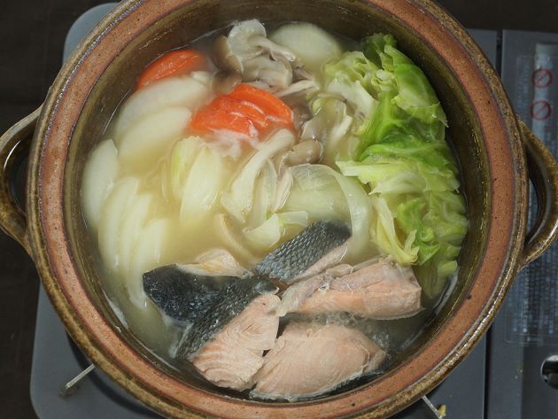 鮭鍋(石狩鍋、秋あじ鍋) 生のサケをぶつ切りにし、玉ネギ、キャベツ、大根、ニンジンなどとみそ仕立ての鍋にしたもの。石狩市新町にある創業明治13(1880)の『金大亭』が発祥とされるが、北海道だけではなくサケの揚がる多くの地域で作られていたはず。クリックで閉じます![]()