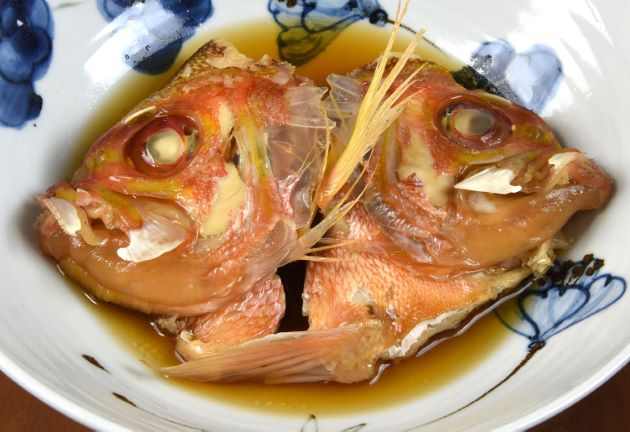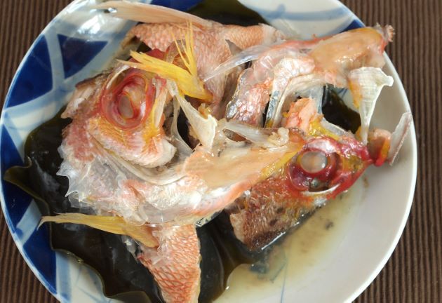 ミハラハナダイの兜煮 2月の個体を煮つけにすると身が極端に締まり、まずくはないが味がなかった。10月の個体は脂があり、身が縮むこともなくおいしく食べられた。兜煮は頭部を梨子割りにして湯通しする。氷水に落として残った鱗とぬめりをとり、水分をきる。これを酒・砂糖・醤油・水を沸かした中で煮る。クリックで閉じます![]()
