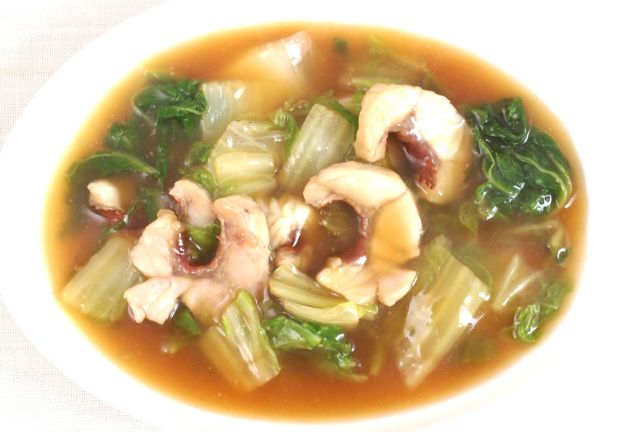 ミハラハナダイの中華煮込み 脂のない個体は、汁にするときも、煮つけにするときも長時間熱を通す。いいだしが出て煮崩れない。ここでは中華風煮込みを作ってみた。適当に切り、湯通しして冷水に落とす。水分をよくきり、シャンタンスープの素・紹興酒、醤油・塩・八角・コショウで味を調えた中で煮る。うま味豊かなスープの中でも存在感があり、白身魚として優秀である。クリックで閉じます![]()