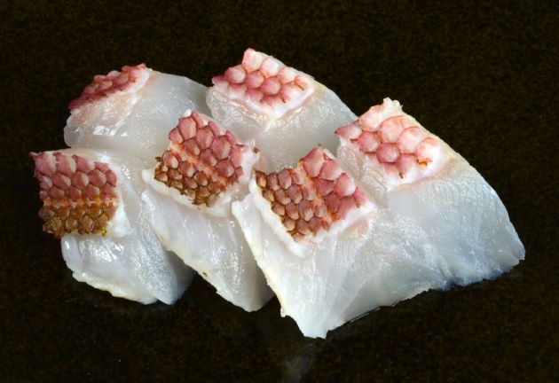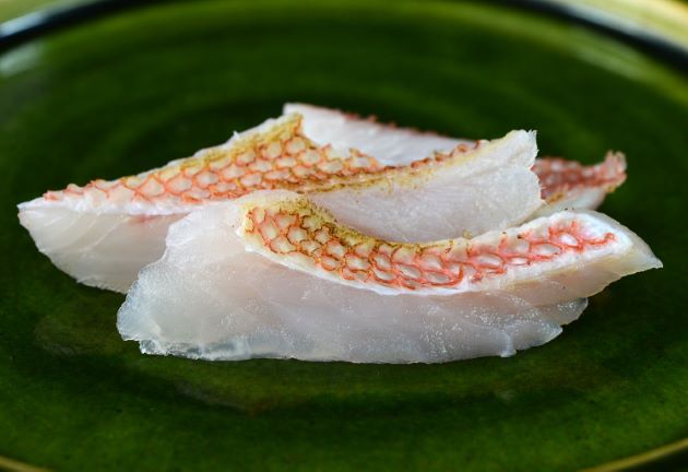 ミハラハナダイの刺身 旬がわかりにくい魚である。固体差も大きく秋の個体でも赤味を帯びた脂のない個体もあった。写真は同じく秋の個体だが非常に脂があり、うま味豊かである。クリックで閉じます![]()